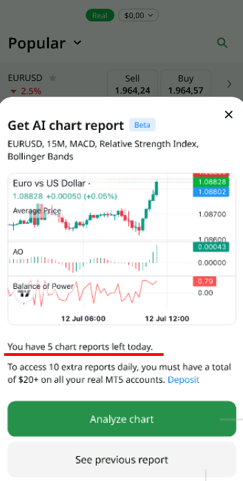 FBS AI Assistant feature is used to create an AI-generated chart analysis to boost your trading. It is free to use, providing up to 15 reports per day. The AI Assistant is integrated directly into the chart, making it easy to access and use.