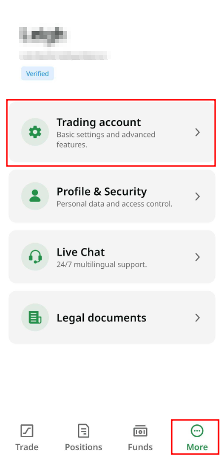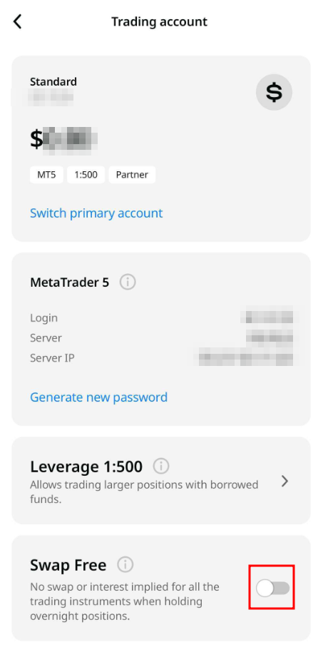 Scroll down to find "Swap-free" in the "Account settings" section and click on the button to activate the option: