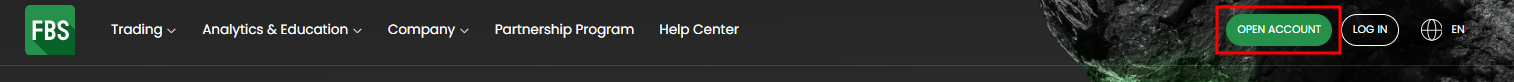 To register a Trader Area with FBS visit our website and click on the “Open an account” button in the top right corner of the website.