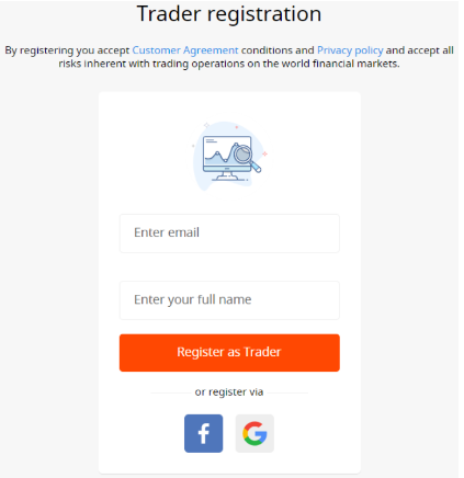 Enter your valid email and full name. Make sure to check that the data is correct; it will be needed for verification and a smooth withdrawal process. Then click on the “Register as Trader” button.