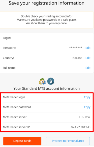 Once you complete this process, you will see your account information. Make sure to save it and keep it in a safe place. Note that you will need to enter your account number (MetaTrader login), trading password (MetaTrader password), and MetaTrader server to MetaTrader4 or MetaTrader5 to start trading.